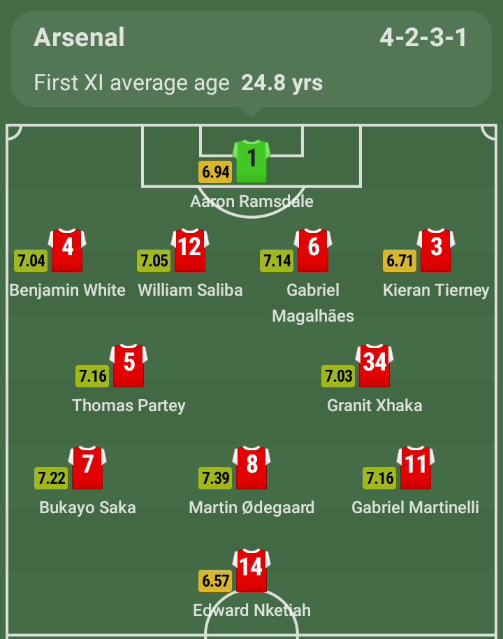 Possible lineup: Ramsdale, White, Saliba, Gabriel, Tierney, Xhaka, Partey, Ordegaad, Martinelli, Nketiah, and Saka.